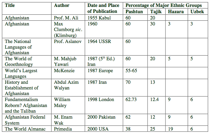 The government produced a new census with a breakdown that reduced the nearly 60% Pashtun majority to 38% and increased the proportion of Tajiks from 12% to 25%. Because these figures were disseminated to international organizations as official government data, they were soon reflected in the National Geographic World Atlas[6] and the World Almanac, among other publications. (See Table 1.)